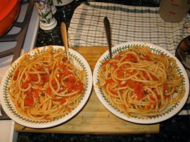 Do I have your attention? Dirty sauce??? Hmmm. A friend of mine at times makes her own tomato sauce by simply sauteing roughly chopped tomatoes. When I told my mother about this, she said “yes, that’s called pasta con la sarsa lorda”. Literally, that means pasta with dirty sauce, because the tomatoes are not skinned and seeded, only the green stem end is cut out, hence dirty. My mom went on to tell me that traditionally Pasta Con La Sarsa Lorda is served with the Perciatelli pasta or any other tubular spaghetti like bucatini, or maccheroncelli. You can also use a tubular macaroni of the penne variety, mostacciolli, pasta al ceppo, etc. This is not a reduced sauce, so to soak up the liquid of this fresh tomato sauce we use tubular pastas. So here is my mom’s recipe.