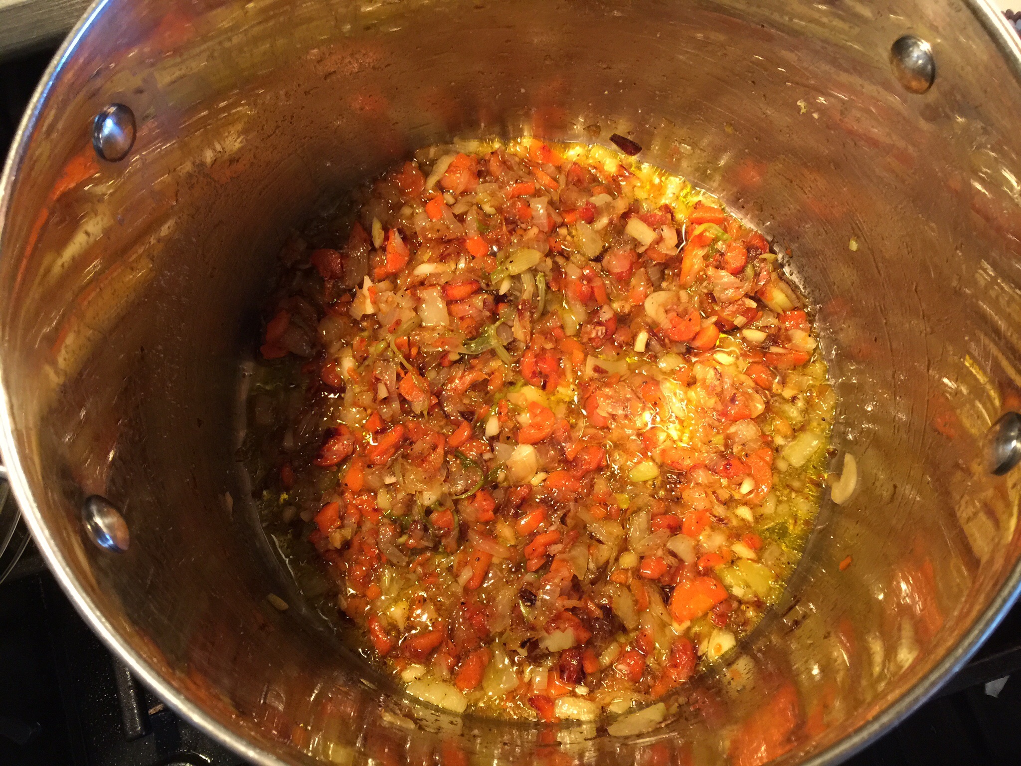 Cooking down the sliced mushrooms in the onion, garlic, celery and carrot mixture. I always get the Baby Bella (Crimini) mushrooms when they are available.