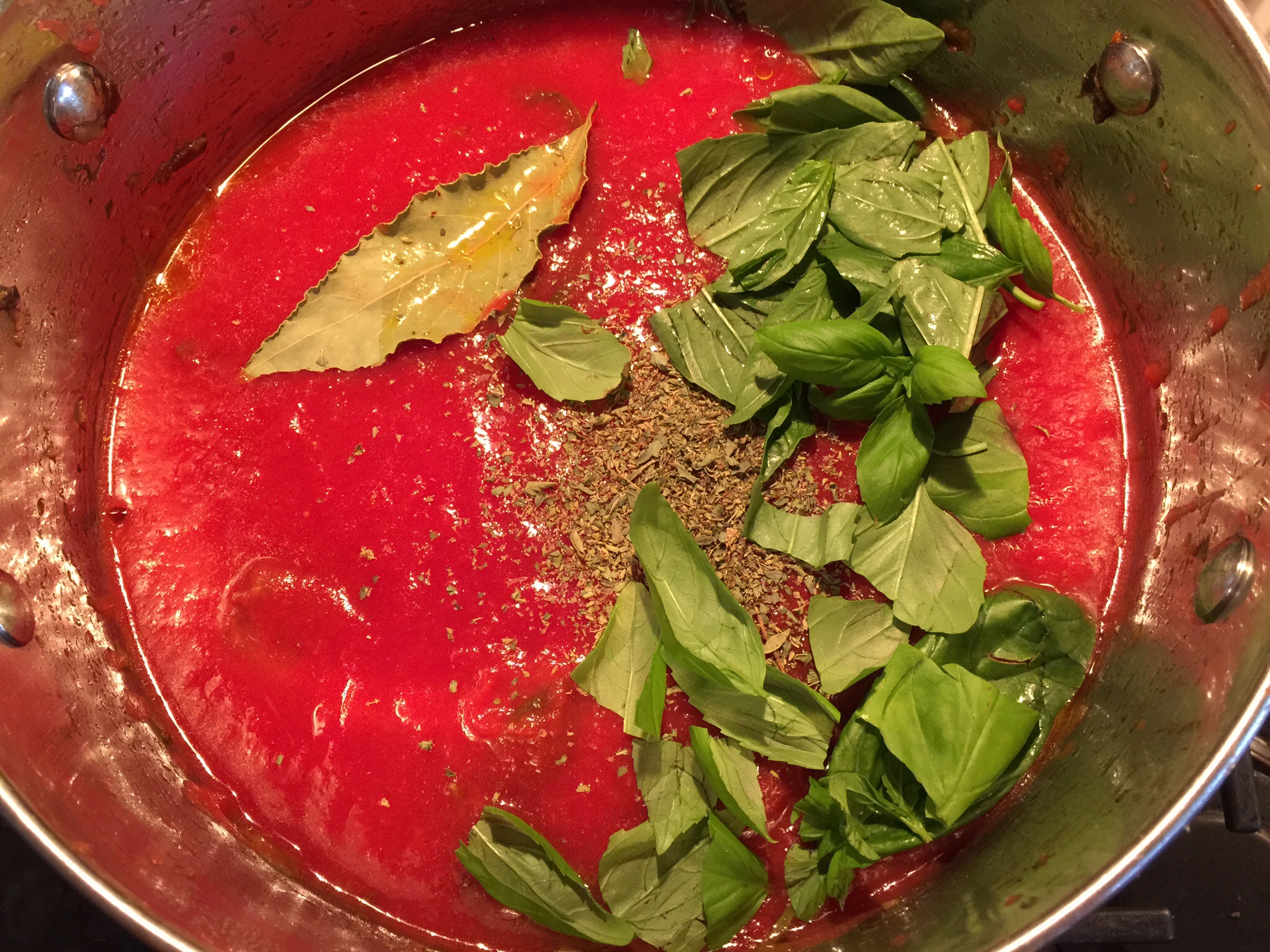I add 1 bay leaf, lots of fresh basil and oregano to the sauce. Simmer, low heat stirring regularly.